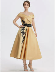 A-Line Cocktail Dresses Elegant Dress Formal Prom Tea Length Sleeveless Off Shoulder Satin with Appliques - US 2 / UK 6 / EU 32