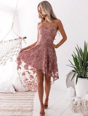 A-Line Cocktail Dresses Elegant Floral Wedding Guest Dress Homecoming Party Asymmetrical Sleeveless Spaghetti Strap Tulle with Appliques