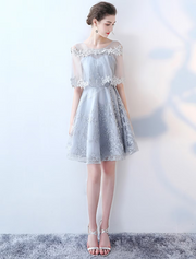 A-Line Elegant Party Wear Cocktail Party Dress Jewel Neck Half Sleeve Short Mini Tulle with Lace Insert Pattern Print - US 2 / UK 6 / EU 32