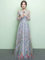 A-Line Elegant Sparkle & Shine Formal Evening Dress Jewel Neck 3/4 Length Sleeve Floor Length Lace with Embroidery - Light Grey / US 2 / UK 6 / EU 32