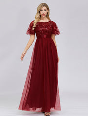A-Line Empire Elegant Party Wear Prom Dress Jewel Neck Short Sleeve Floor Length Tulle with Embroidery - Burgundy / US 2 / UK 6 / EU 32
