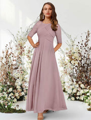 A-Line Evening Gown Elegant Dress Wedding Guest Floor Length Half Sleeve Jewel Neck Chiffon with Pleats Ruched