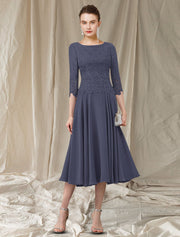 A-Line Mother of the Bride Dress Elegant Jewel Neck Tea Length Chiffon Lace 3/4 Length Sleeve with Pleats Appliques - Stormy / US 2 / UK 6 / EU 32