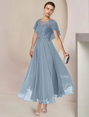 A-Line Mother of the Bride Dress Elegant Scoop Neck Tea Length Chiffon Lace Sleeveless with Beading Appliques - Blue Frost / US 2 / UK 6 / EU 32