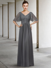 A-Line Mother of the Bride Dress Elegant V Neck Floor Length Chiffon Lace Half Sleeve with Pleats Appliques