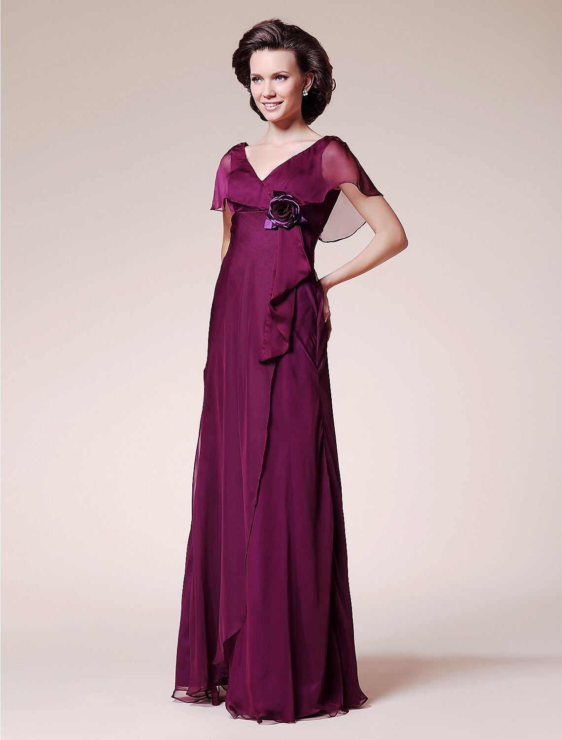 A-Line Mother of the Bride Dress Elegant V Neck Floor Length Chiffon Short Sleeve No with Ruffles Flower - US 2 / UK 6 / EU 32