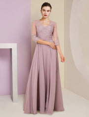 A-Line Mother of the Bride Dress Formal Wedding Guest Elegant V Neck Floor Length Chiffon Lace 3/4 Length Sleeve with Pleats Appliques