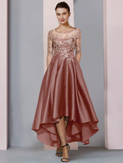 A-Line Mother of the Bride Dress Formal Wedding Guest Party Elegant High Low Scoop Neck Asymmetrical Tea Length Satin Lace Half Sleeve with Pleats Beading Appliques
