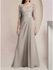 A-Line Mother of the Bride Dress Wedding Guest Elegant Scoop Neck Floor Length Chiffon Half Sleeve with Lace Ruching Solid Color - US 2 / UK 6 / EU 32