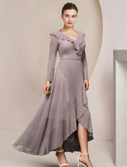 A-Line Mother of the Bride Dress Wedding Guest Elegant V Neck Asymmetrical Ankle Length Chiffon Long Sleeve with Ruffles Solid Color