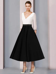 A-Line Mother of the Bride Dress Wedding Guest Elegant V Neck Tea Length Chiffon Satin Short Sleeve with Sash / Ribbon Color Block