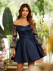 A-Line/Princess Satin Lace Off-the-Shoulder Long Sleeves Short/Mini Dresses