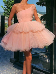 A-Line/Princess Tulle Ruffles One-Shoulder Sleeveless Short/Mini Dresses