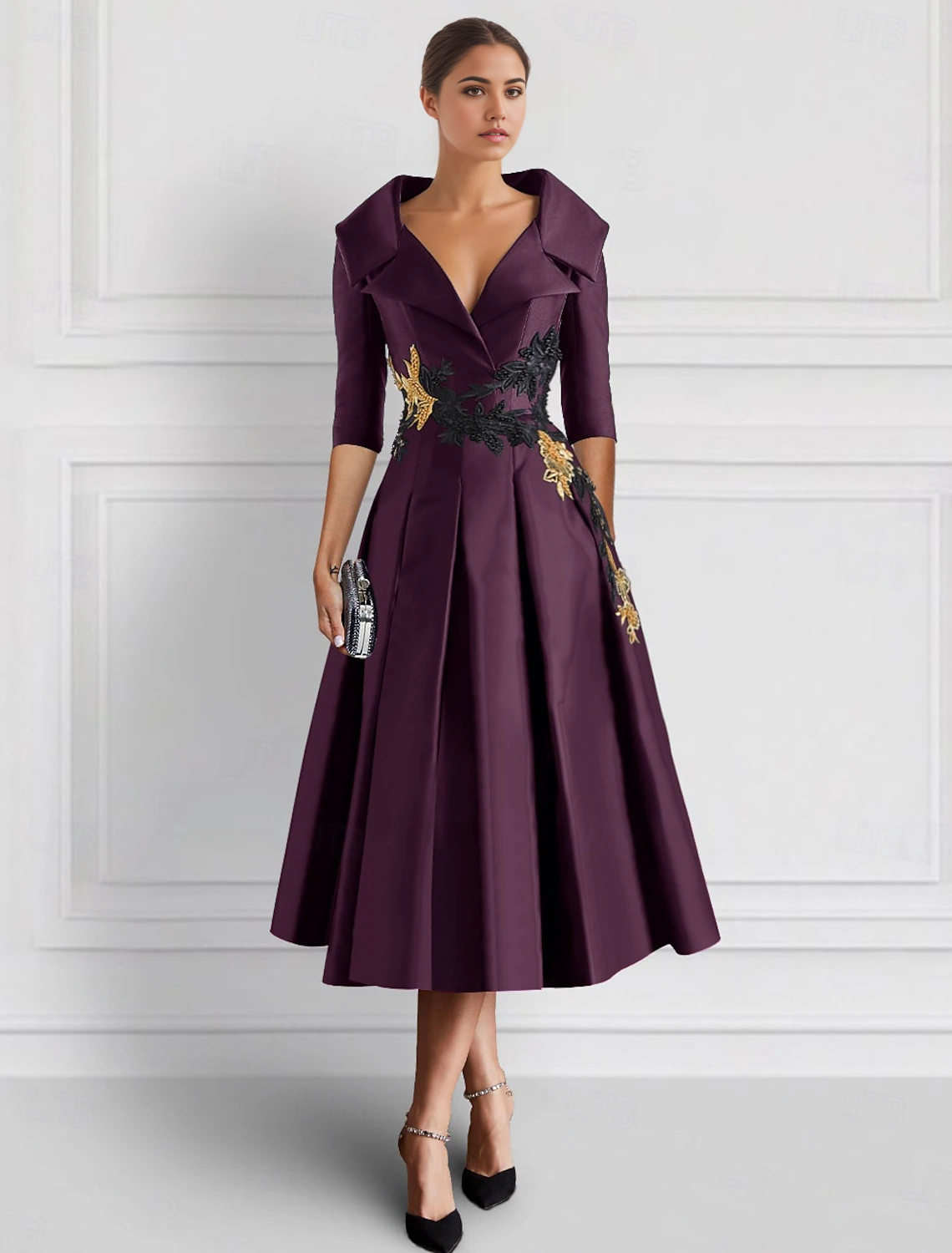 Black Purple Embroidered A-Line Cocktail Dresses Mother of Bride Elegant Formal Ankle Length 3/4 Length Sleeve Shirt Collar Pocket Satin with Appliques