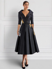 Black Purple Embroidered A-Line Cocktail Dresses Mother of Bride Elegant Formal Ankle Length 3/4 Length Sleeve Shirt Collar Pocket Satin with Appliques - US 2 / UK 6 / EU 32 / Black