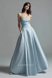 FannyWe Elegant Sky Blue A Line Satin Strapless Ruched Long Formal Dress formal wear dresses