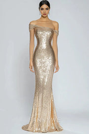 FannyWe Elegant Sparkly Champagne Mermaid Off the Shoulder Sequins Long Formal Dress formal wear dresses