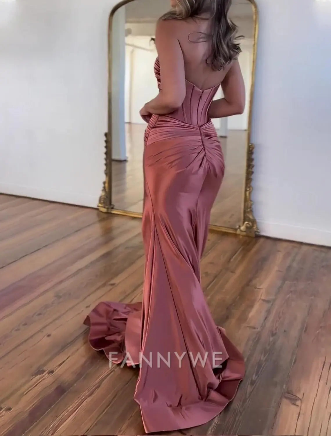 FannyWe Simple A-Line Prom Dresses Elegant Dress Formal Floor Length Sleeveless Strapless Satin with Ruched Slit
