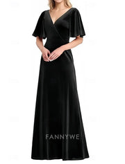 FannyWe Simple A-Line Prom Dresses Elegant Dress Party Wear Prom Floor Length Short Sleeve V Neck Velvet with Criss Cross