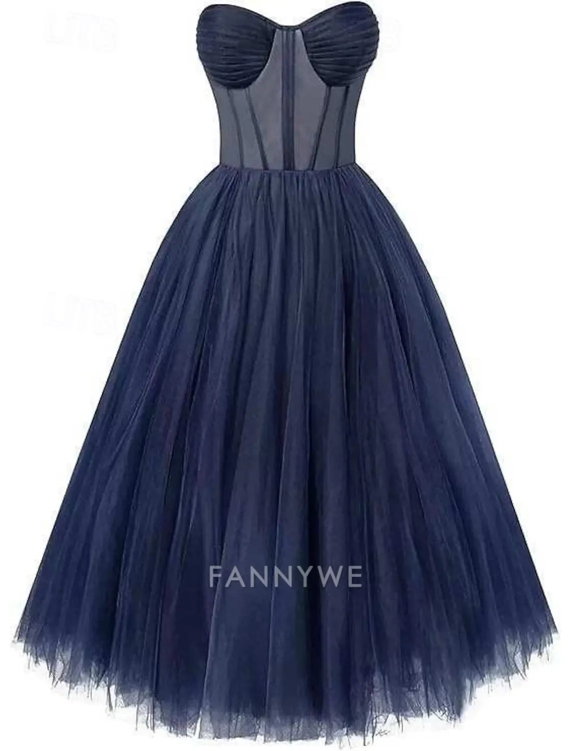 FannyWe Simple A-Line Prom Dresses Party Dress Evening Party Cocktail Party Tea Length Sleeveless Sweetheart Tulle with Ruched