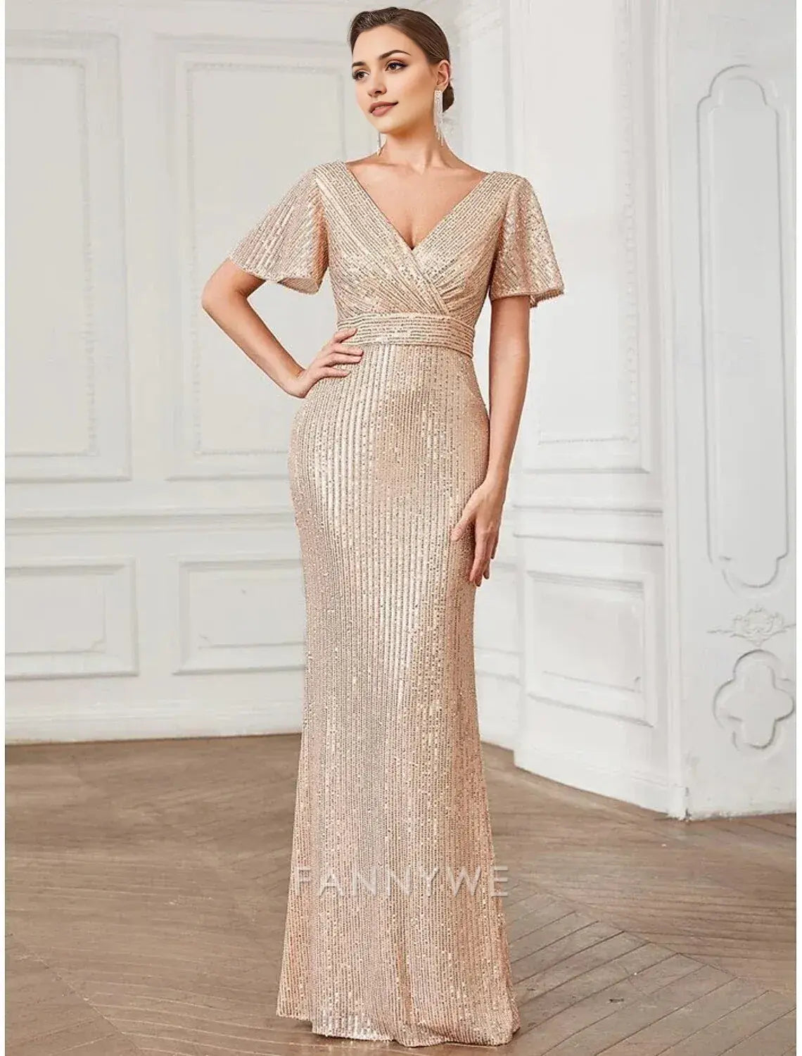 FannyWe Simple A-Line Prom Dresses Party Dress Formal Floor Length Long Sleeve V Neck Sequined with Glitter - US 2 / UK 6 / EU 32