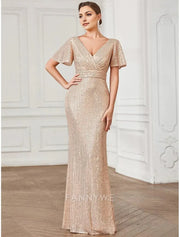 FannyWe Simple A-Line Prom Dresses Party Dress Formal Floor Length Long Sleeve V Neck Sequined with Glitter