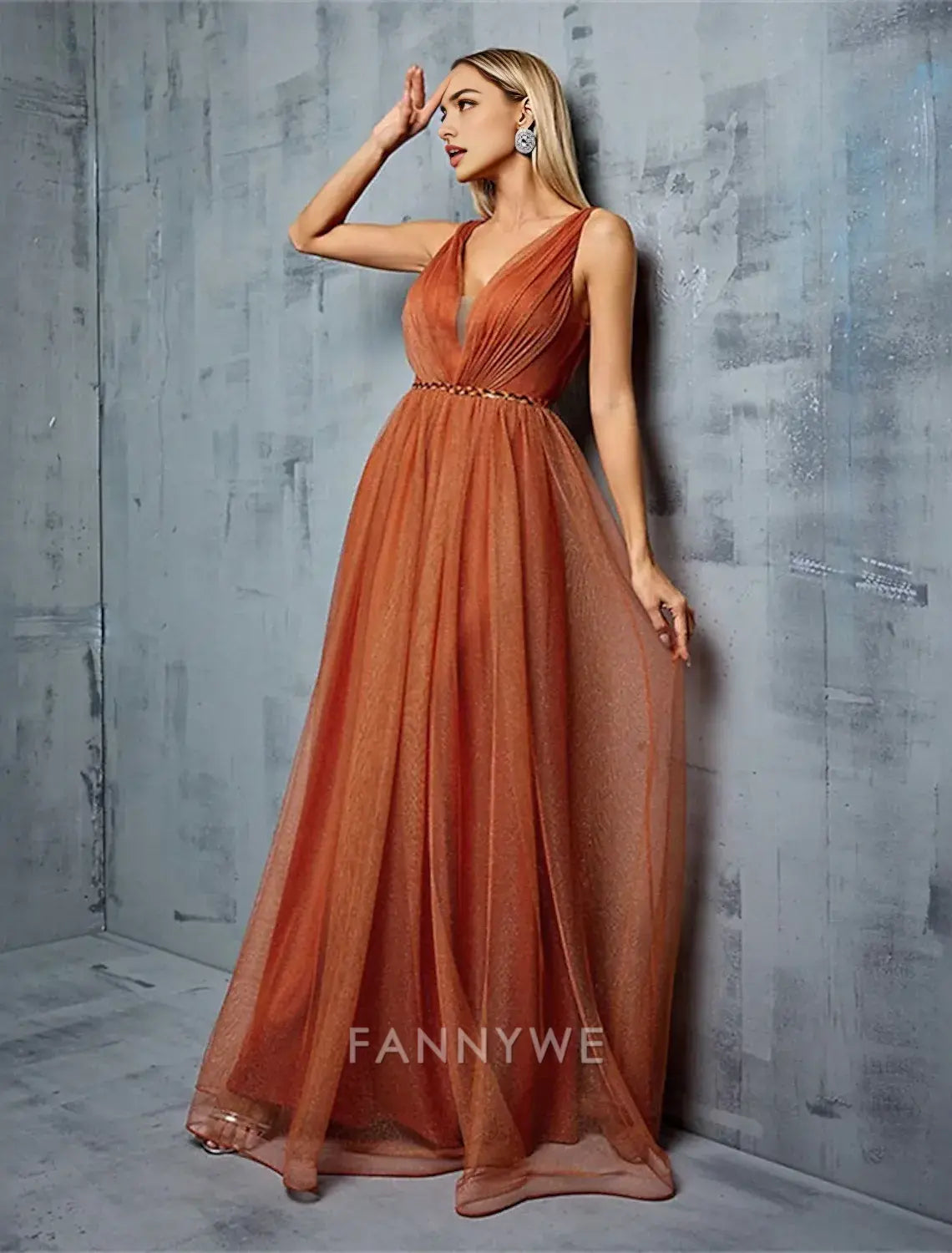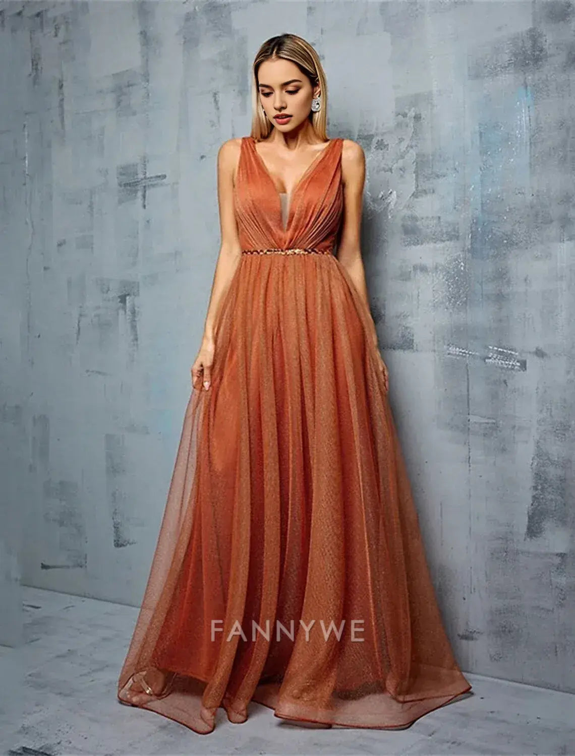 FannyWe Simple A-Line Quinceanera Dresses Elegant Dress Performance Wedding Floor Length Sleeveless V Neck Chiffon with Pleats