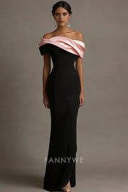 FannyWe Simple Black and Pink Satin Off the Shoulder Sheath Long Evening Dress