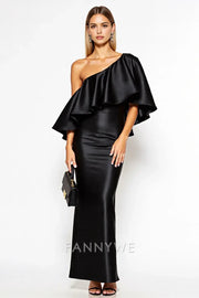 FannyWe Simple Black Sheath One Shoulder Satin Long Black Tie Dress with Ruffles