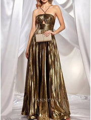 FannyWe Simple Lurex Pleat Gold Maxi Dress A-Line Quinceanera Dresses Halter Neck Elegant Dress Wedding Guest Floor Length Lace Up