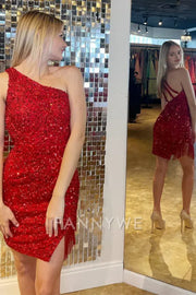 FannyWe Simple One-Shoulder Red Sequin Short Homecoming Dress with Fringes formal wear dresses