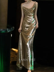 FannyWe Simple Sheath / Column Prom Dresses Glittering Dress Formal Wedding Floor Length Sleeveless Cowl Neck Polyester with Glitter