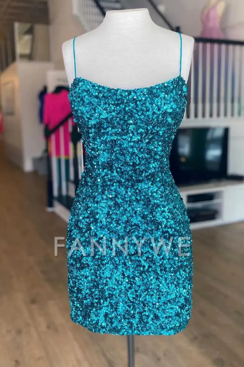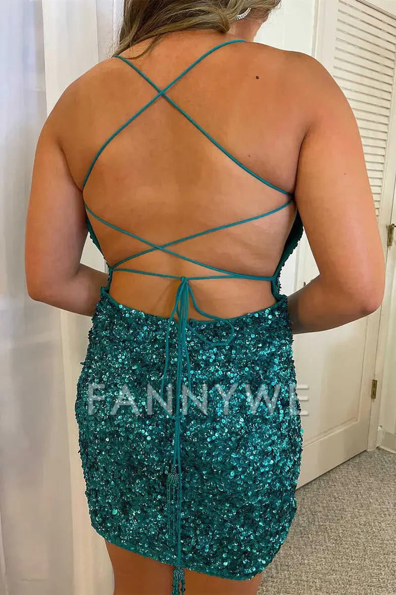 FannyWe Simple Teal Blue Sequin Lace-Up Mini Cocktail Dress formal wear dresses