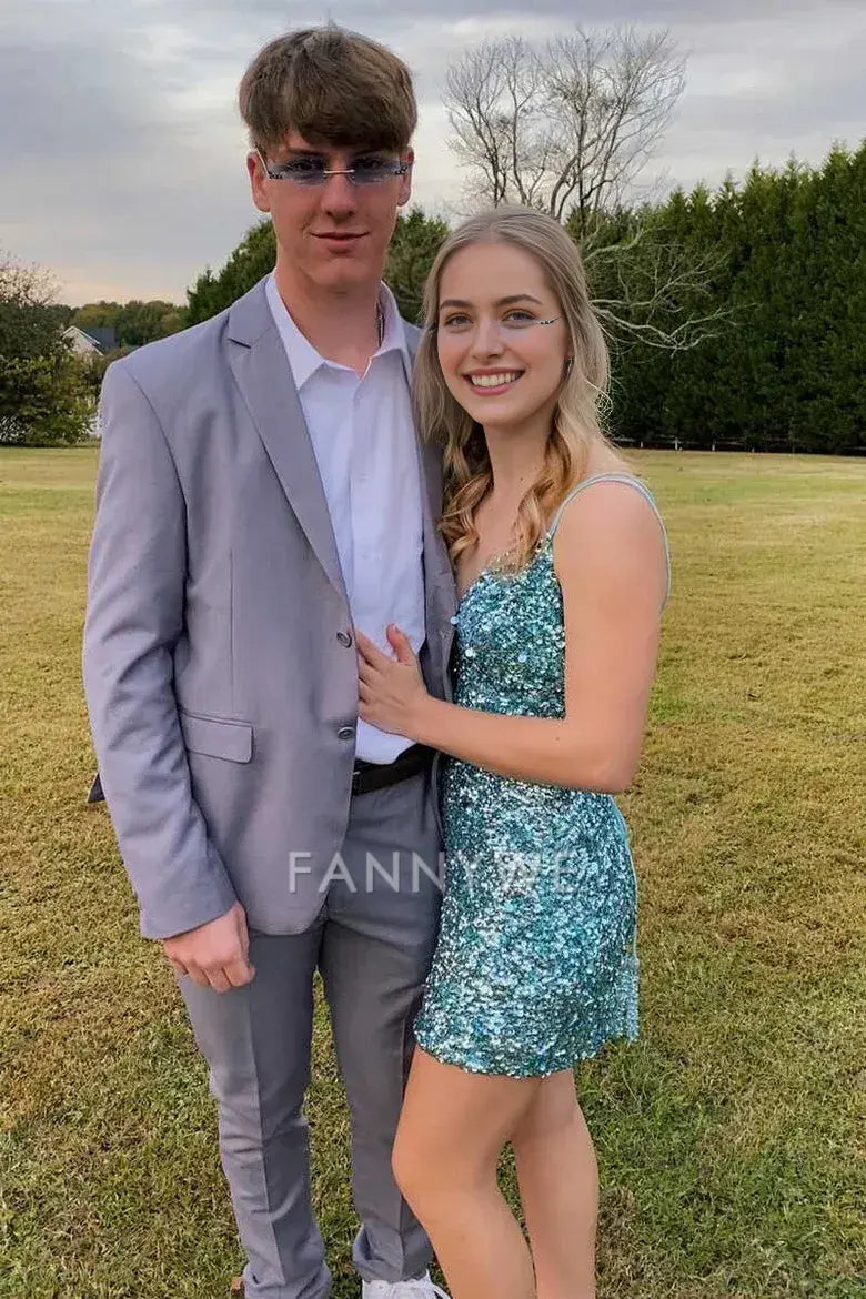 FannyWe Simple Tiffany Blue Sequin V-Neck Lace-Up Mini Homecoming Dress formal wear dresses
