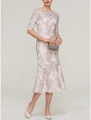 Mermaid / Trumpet Mother of the Bride Dress Wedding Guest Elegant Petite Jewel Neck Tea Length Stretch Satin Imitated Silk Half Sleeve with Lace Pleats
