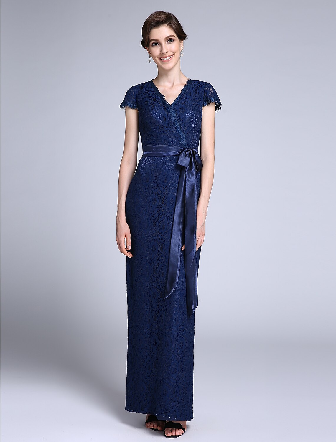 Sheath / Column Mother of the Bride Dress Furcal V Neck Ankle Length Lace Short Sleeve No with Lace Bow(s)