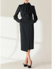 Sheath / Column Mother of the Bride Dress Wedding Guest Elegant Petite High Neck Tea Length Stretch Chiffon Long Sleeve with Bow(s) Split Front Ruching