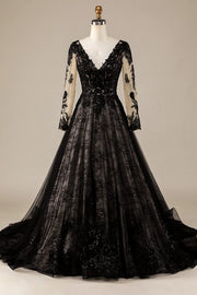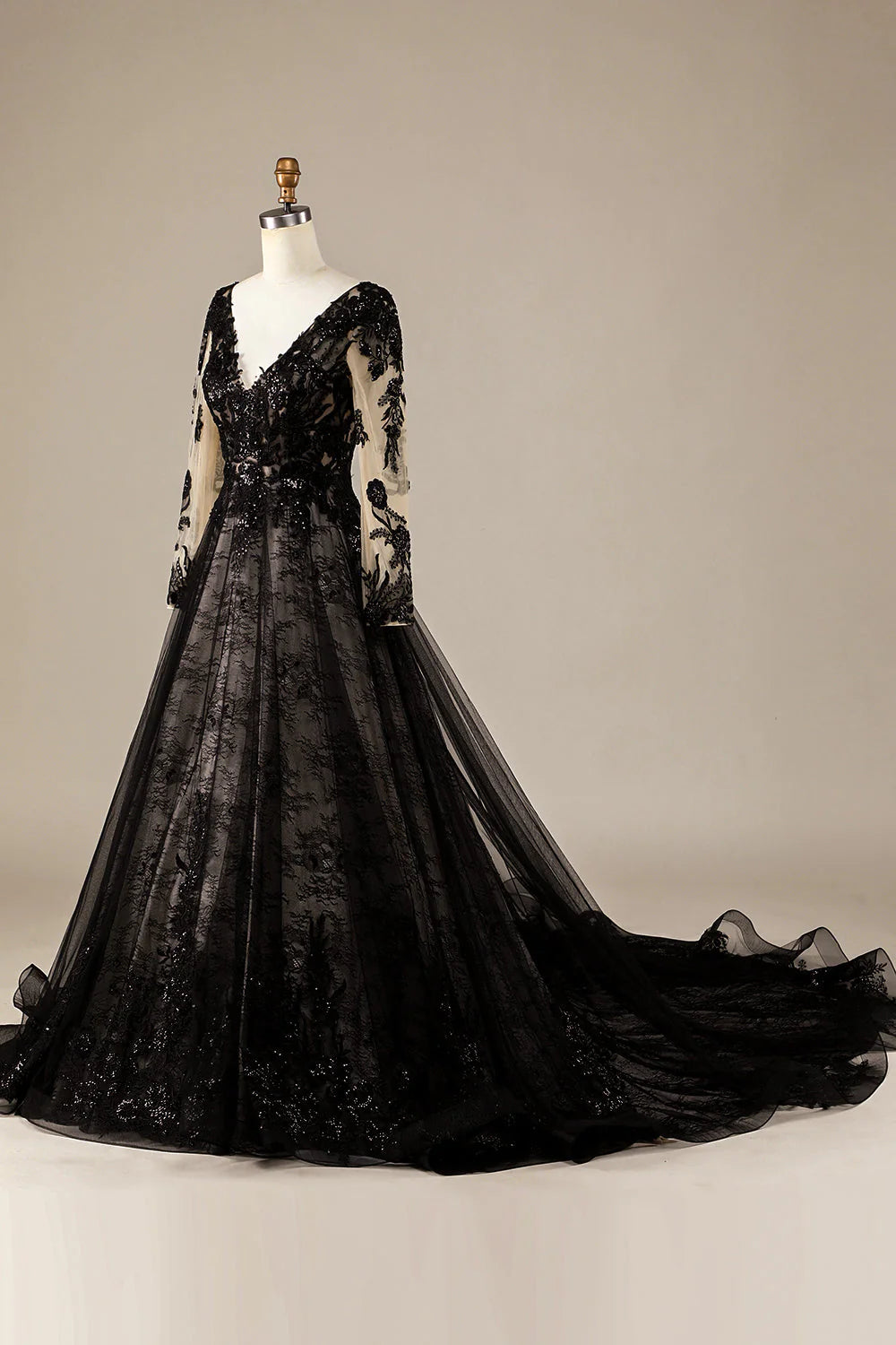 Sparkly Black Long Sleeves Chapel Train Lace Wedding Dress