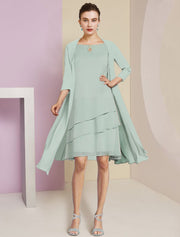 Two Piece A-Line Mother of the Bride Dress Formal Wedding Guest Elegant Scoop Neck Knee Length Chiffon 3/4 Length Sleeve with Tier