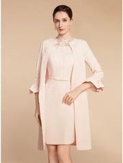 Two Piece A-Line Mother of the Bride Dress Wedding Guest Elegant Petite Jewel Neck Short / Mini Lace Stretch Fabric 3/4 Length Sleeve with Bow(s) Ruffles Solid Color