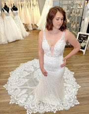 White Mermaid Deep V-Neck Open Back Chapel Train Wedding Dress