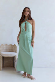 Sage Green Beaded Halter Neck Keyhole Ruched Waist Maxi Dress