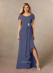 Plus size Cowl Neck Ruffled Side Slit Chiffon Mother of the Bride Dress. Occasions: Prom, black tie events, formal weddings, and upscale parties.