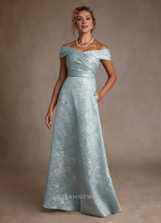 Elegant Off-Shoulder Textured Brocade Floral Jacquard A-Line Maxi Dress with Pockets Mother of the Bride Dress