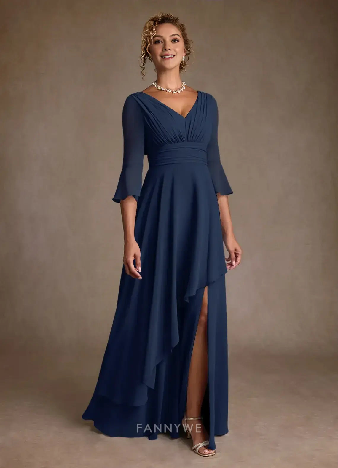 V-Neck Bell Sleeve Ruched Chiffon A-Line Mother of the Bride Dress. Occasions: Prom, black tie events, formal weddings, and upscale parties.