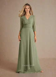 V-Neck Three-Quarter Sleeve Ruched Chiffon Mother of the Bride Dress. Occasions: Prom, black tie events, formal weddings, and upscale parties.