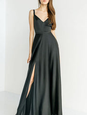 A-Line Bridesmaid Dress Spaghetti Strap Sleeveless Open Back Floor Length Stretch Satin with Split Front / Solid Color