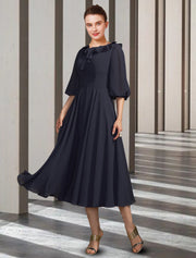 A-Line Mother of the Bride Dress Elegant Jewel Neck Tea Length Chiffon Half Sleeve with Pleats Ruffles