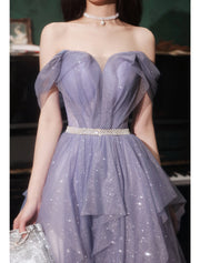 A-Line Prom Dresses Sparkle & Shine Dress Wedding Guest Birthday Floor Length Sleeveless Off Shoulder Tulle with Sequin - Purple / US 2 / UK 6 / EU 32