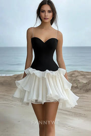 FannyWe Elegant Black and White Sweetheart Short Graduation Dress with Ruffles